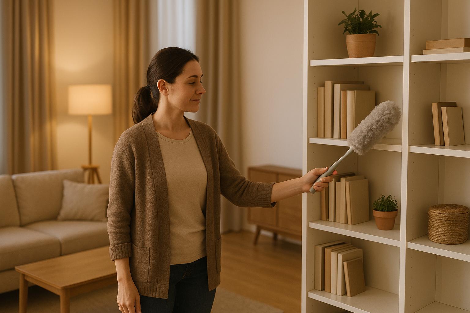 Use lightweight telescoping tools. Tools with extendable poles let you clean hard-to-reach areas like ceiling fans or high shelves without straining your posture. These tools eliminate the need for ladders and help you maintain a comfortable stance while cleaning.