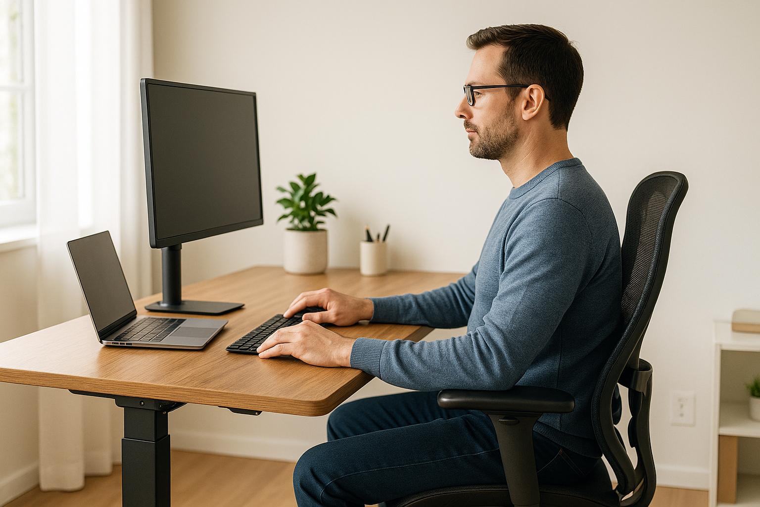 A quick test: Sit at the edge of your chair with your back straight, shoulders relaxed, and palms resting upward in your lap. If this position eases your tension, your current desk setup might be contributing to your discomfort.